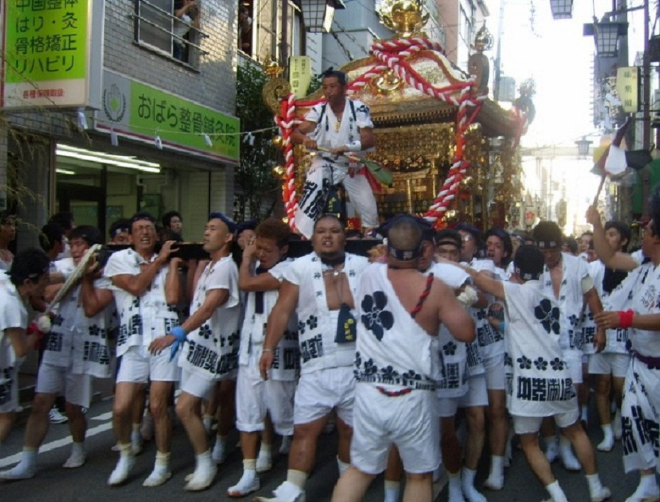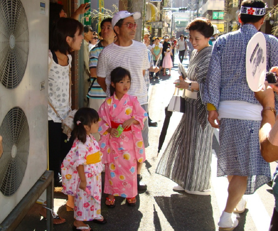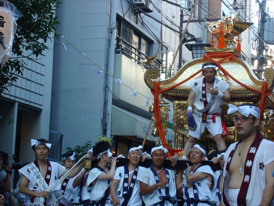 물러나 건물 아래에 자리를 잡고 신사를 나오는 마쓰리 행열을 구경했던 기억이 납니다.