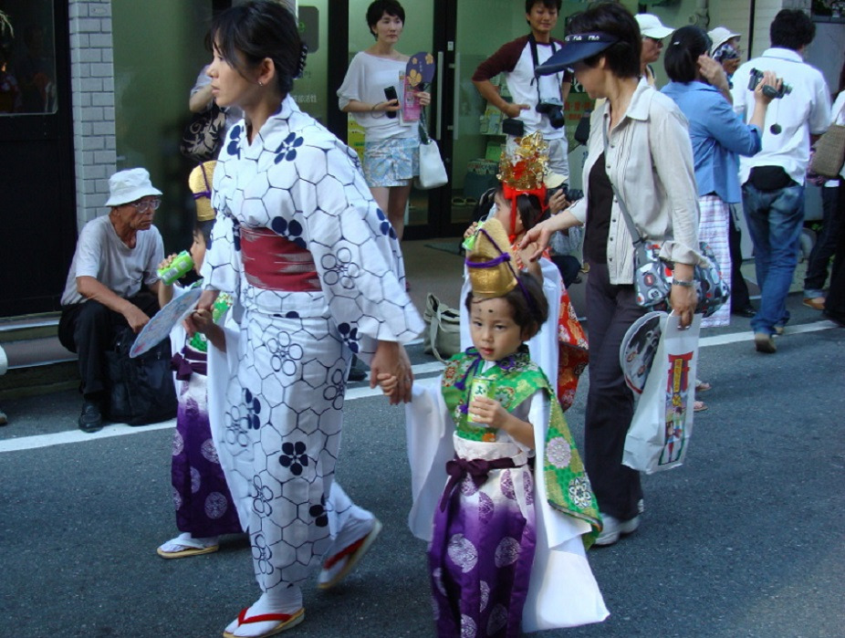 뒤를 이어 금빛 화관을 쓰고 화려하기 그지 없는 옷을 입은 남녀 어린이들이 기모노를 잘 차려 입은 엄마의 손을