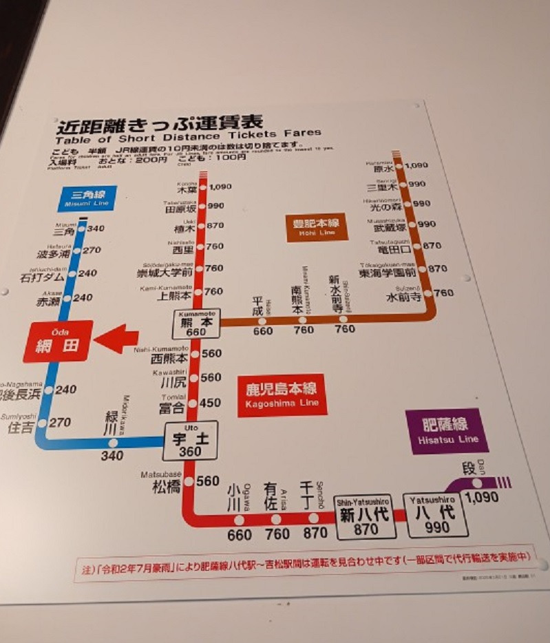 2025년 12월 6일 구마모토역에서 미스미(三角 삼각) 행 기차를 타고 오다 (綱田 강전) 역에 내려