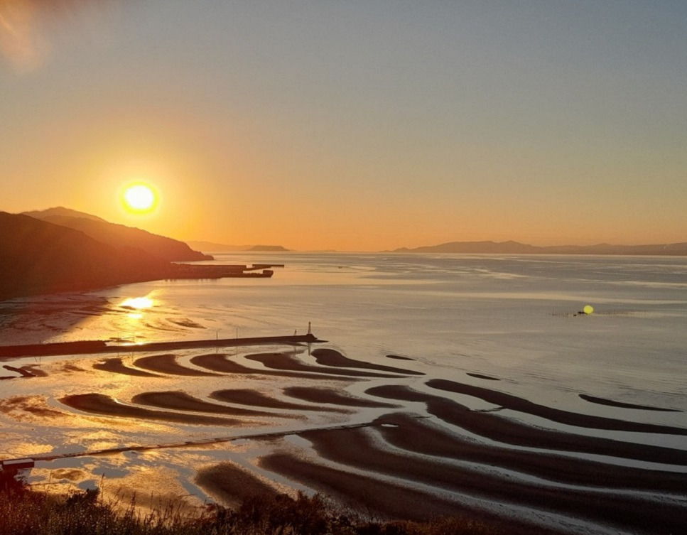 이런 저런 옛 생각을 하는 사이에 오코시키 시숀 (御與來海岸) 에 석양이 되니.... 썰물이라