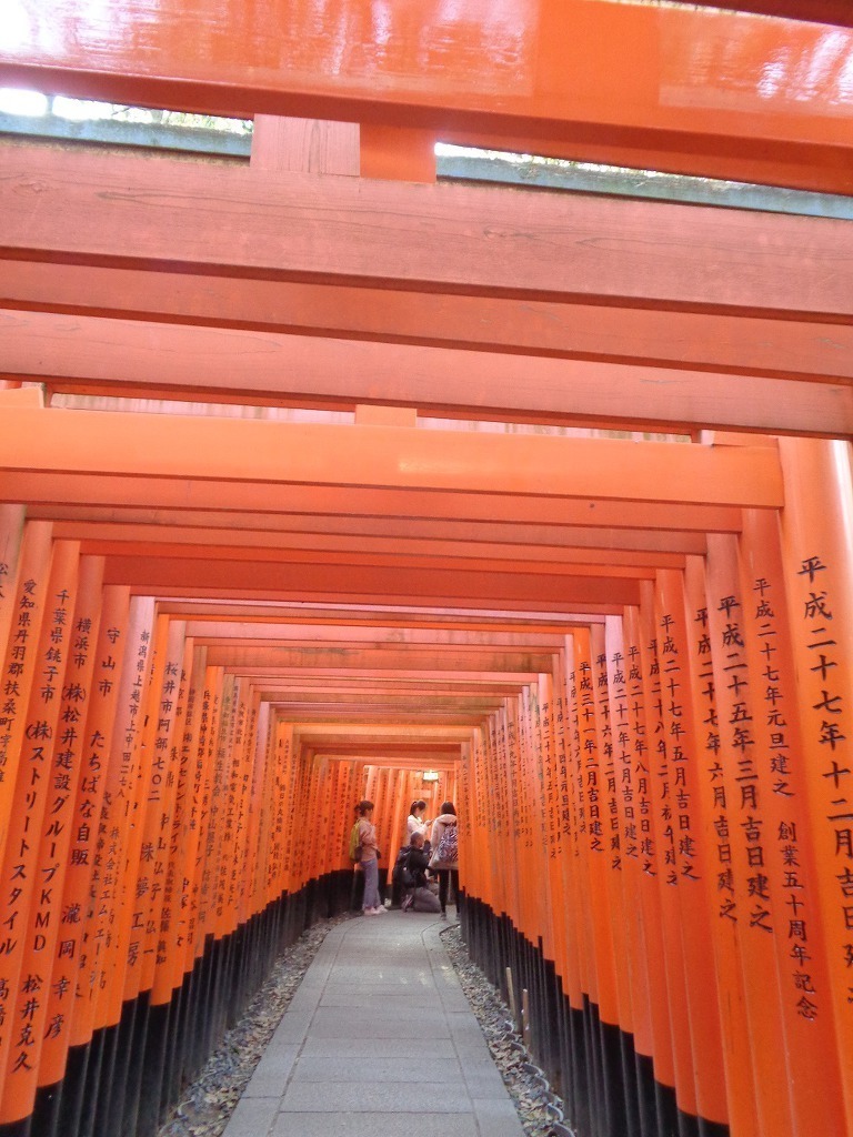 천개의 붉은 도리이가 구불구굴 터널을 이룬 길 이 장관을 이룹니다.