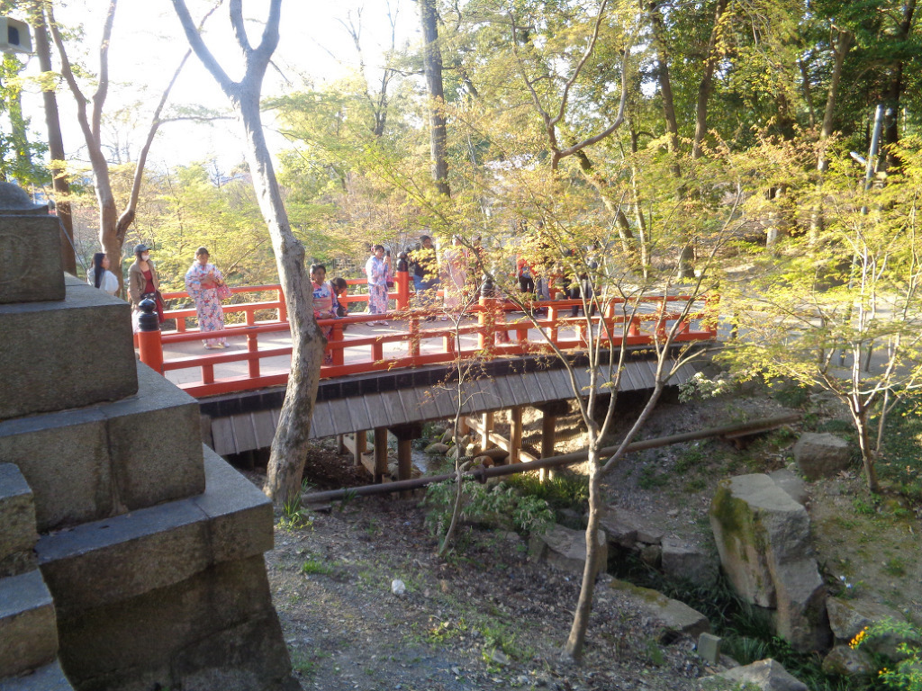 그러고는 성을 걸어 내려와서는 시가지에 이르러 JR 모모야마역 을 지나 더 내려오다가