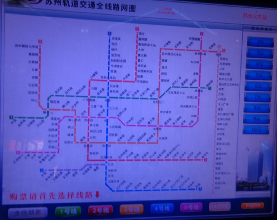 중국 도시에서 지하철 표를 끊는 것은 아주 쉬우니 기계에는 시내 지하철 노선도가 보이니 첫 화면에서 먼저