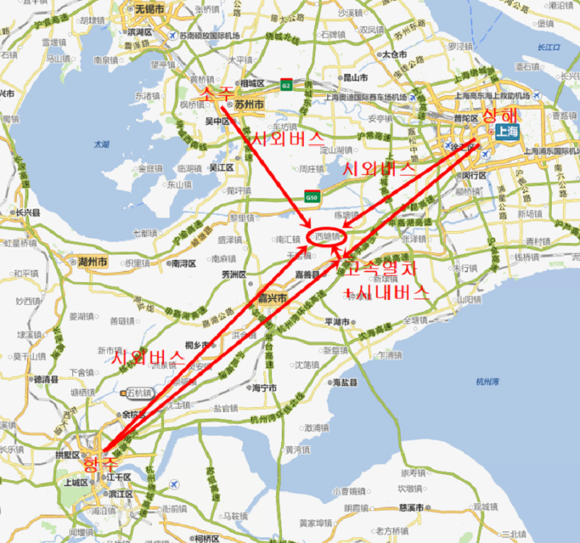 시탕(서당) 수향마을로 가는 방법은 상해(상하이), 항주(항저우), 소주(쑤저우) 세 도시에서 시외버스