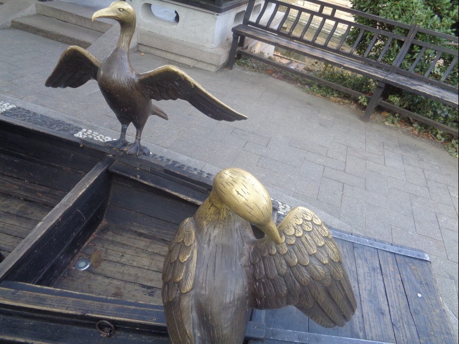젓는 어부와 그 아래 앉아 있는 물고기를 잡는다는 가마우지 새 인가 합니다.