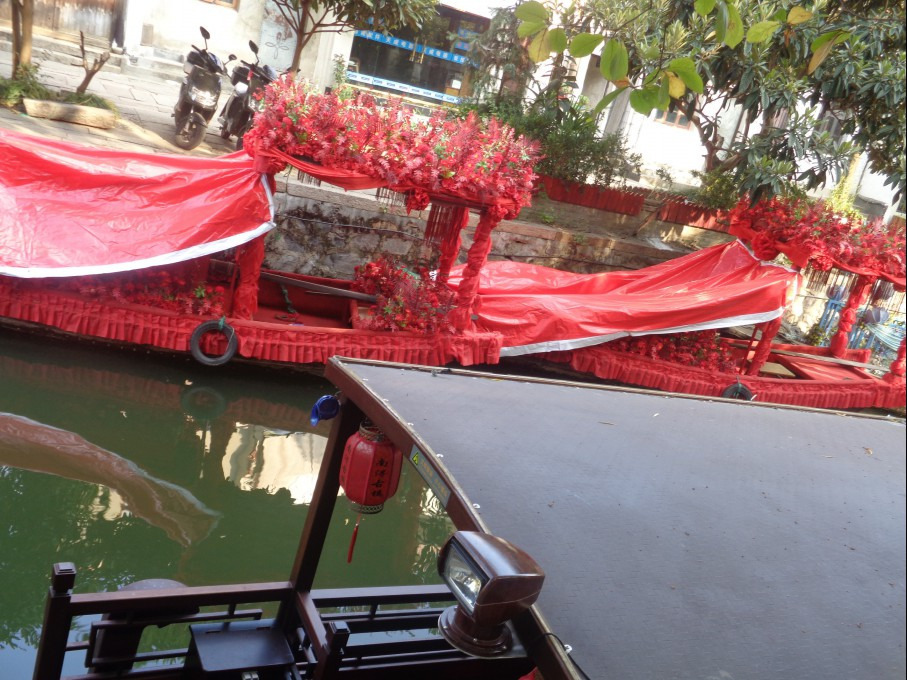 물과 배는 저우좡(주장)의 생명이니 파란색 천으로 덮인 나무배는 노를 저을때 배가 내는 리듬감 있는 소리,