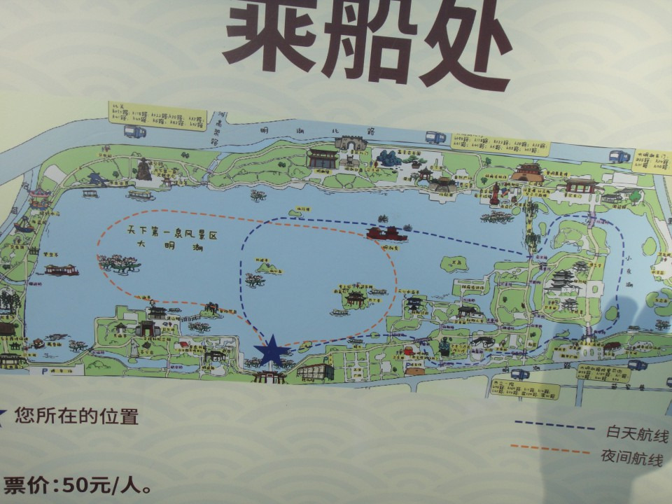 하고는 내려와 택시 기사에게 “따밍후! ” 라고 외치고는 “大明湖” 라고 적힌 종이를 보여 줍니다.