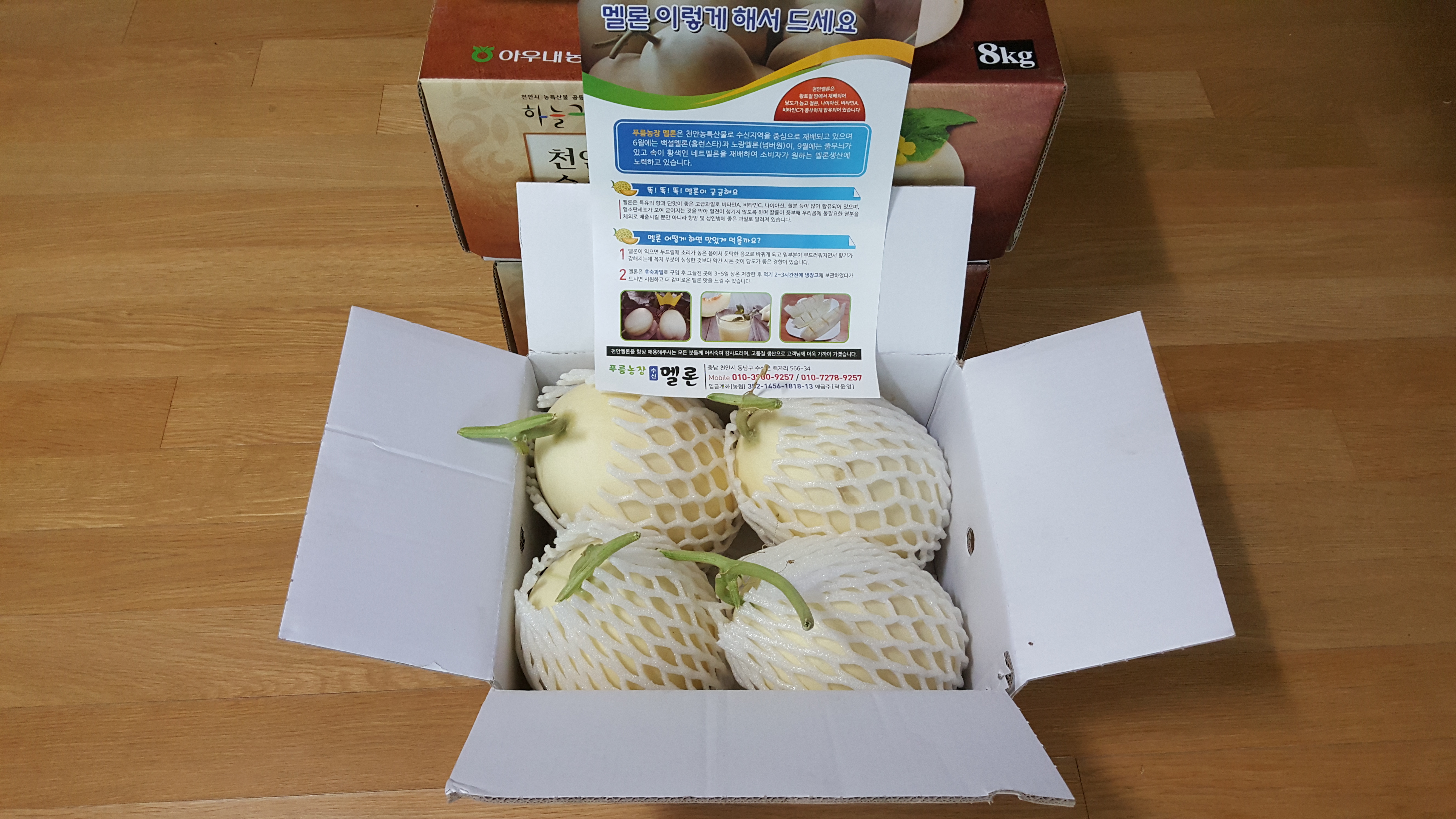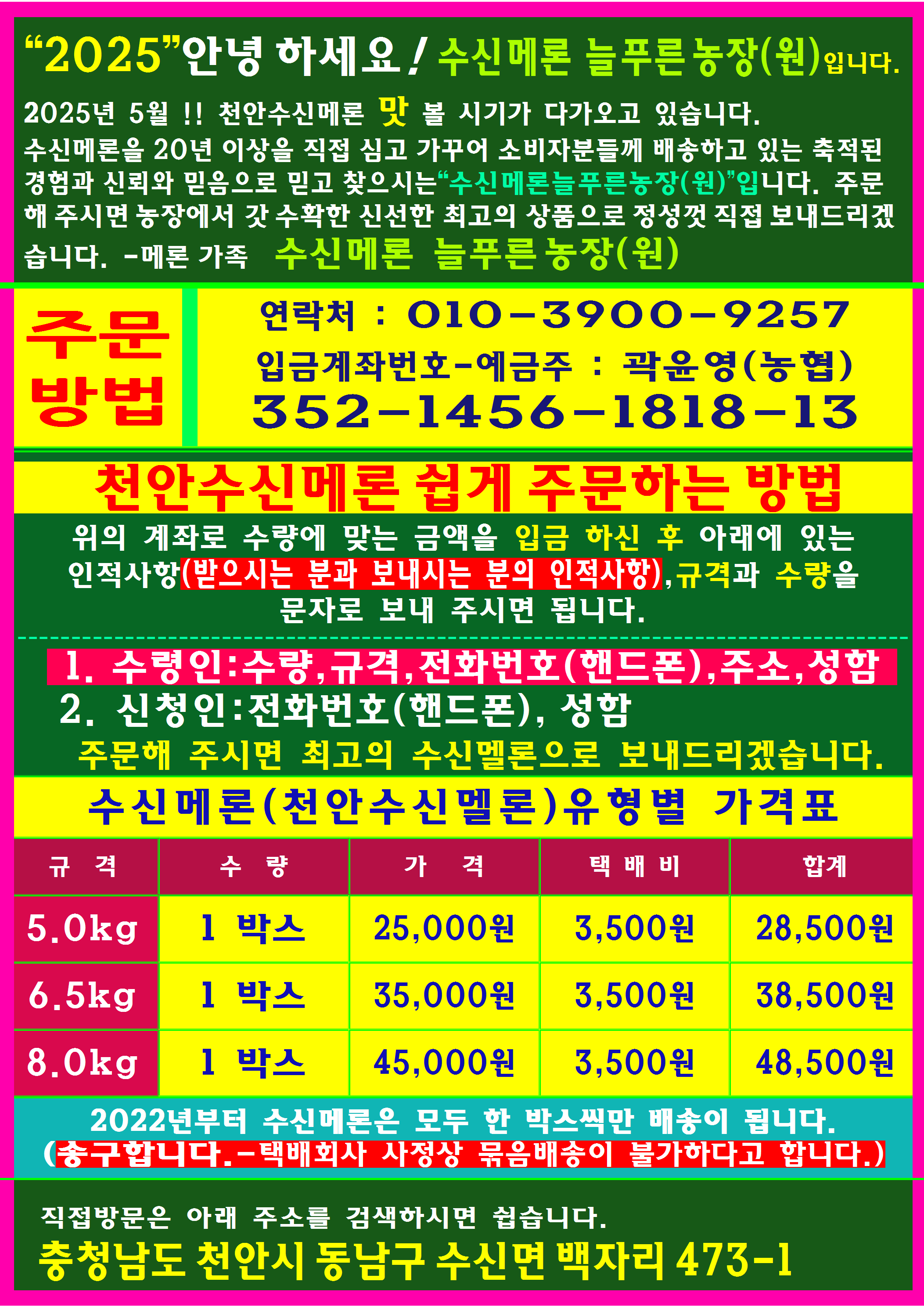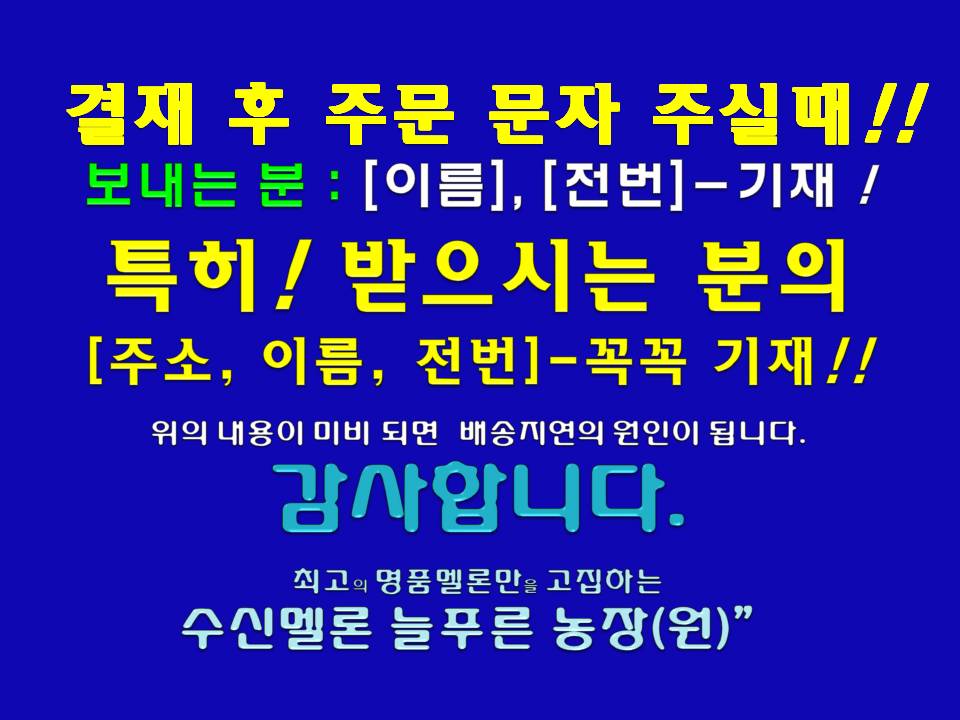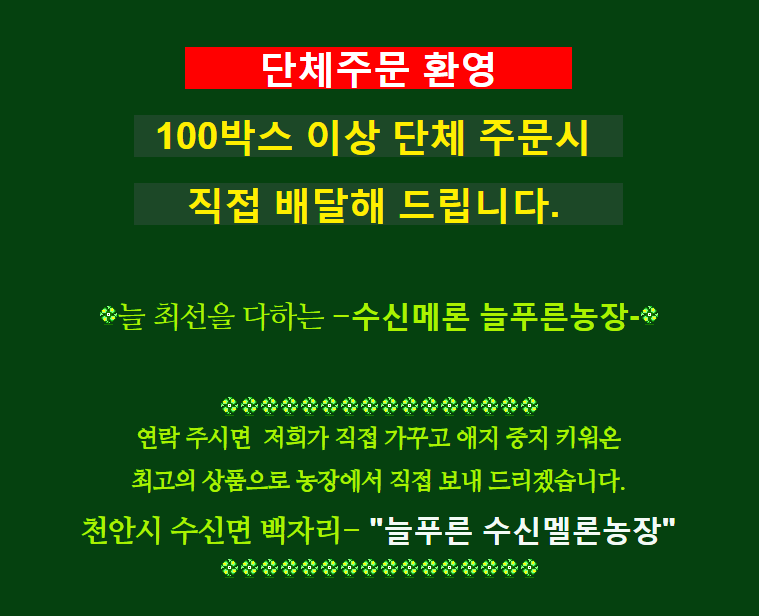 직접 천안시 동남구 수신면 백자리 [수신메론 늘푸른농장]에서 직접 재배한 품질 좋은 천안 수신메론, 수신멜론, 하늘그린메론을 주문 받고 있습니다.아래에 있는 번호로 연락을 주시면 주문 방법을 자세히 알려드립니다.그렇지 않으면 아래에 있는 계좌로 입금을 하신 후 인적사항을 문자로 주시거나 전화로 연락 주시면 빠른 시간 내에 배송해 드리겠습니다.