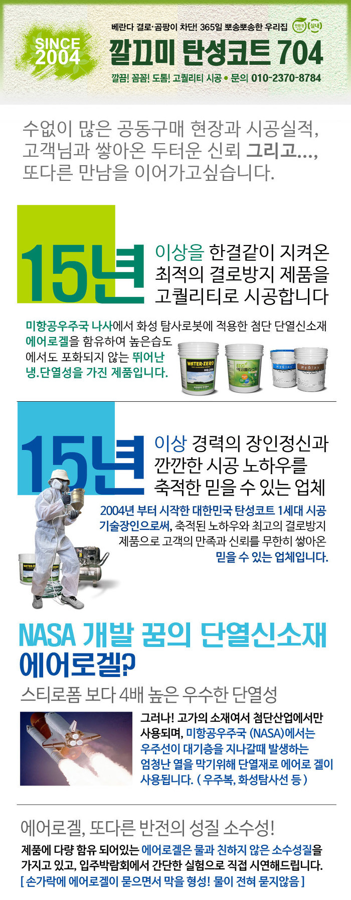 벽면 균열 및 페인트 박리된 부분 제거 -> 퍼티 2~3회 보수 작업 -> 실리콘 터짐 과 균열부분 고탄성 실리콘으로 보수 작업-> 보양작업 -> 1차 단열페인트 하도작업 -> 2차 상도 뿜칠작업 -> 보양재 철거순으로 시공을 진행하였습니다.