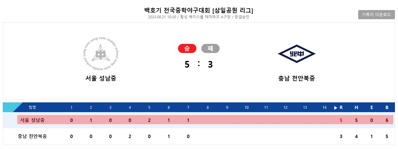 [ 중학야구 ] 백호기 전국중학야구대회 [삼일공원 리그] 성남중 준결승전 결과_8월 21일 (월) 작성자허연우 맘 (12기)|작성시간23.09.05|조회수22 목록 댓글 0 글자크기 작게가 글자크기 크게가 [ 출처 : 대한야구소프트볼협회(KBSA) (korea-baseball.com) ]▲ 14기 3학년 최세환 다음검색 현재 게시글 추가 기능 열기 북마크 공유하기 신고 센터로 신고 댓글 댓글 0 댓글쓰기 답글쓰기 댓글 리스트