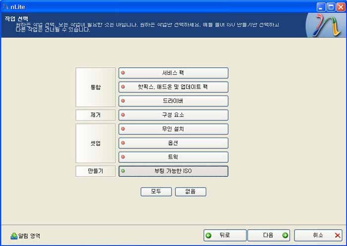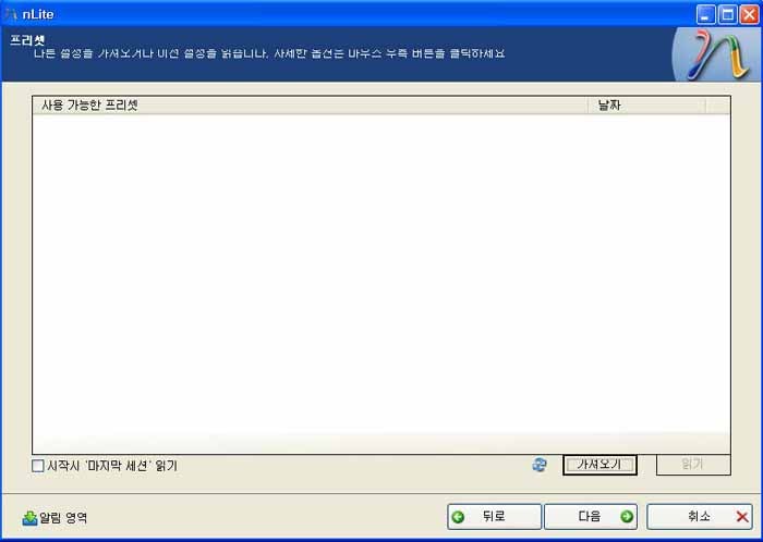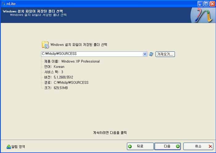 nLite를 실행하시고 언어를 코리안으로 바꾸시면 한글로 바뀝니다. 이제 다음을 누르시면 밑에 화면처럼 나타나는데 가져오기를 누르시는데 경로를 밑에 그림과 같은 경로를 지정해주세요.
