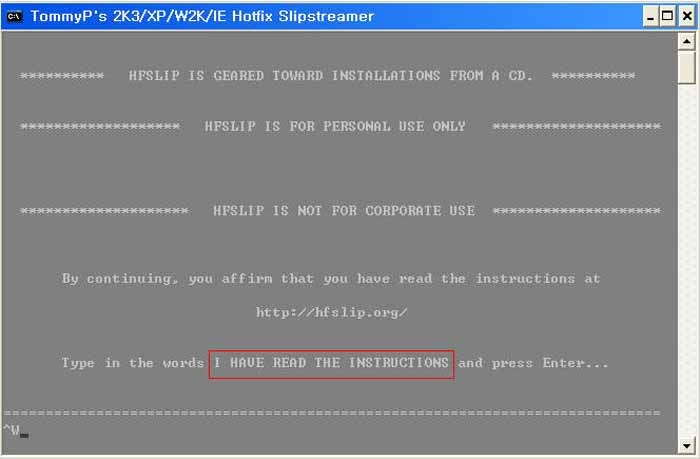 이제 준비가 끝났으면 hfslip-1.7.9.cmd를 한 번 더 실행합니다. 엔터를 5번 누르시면 밑에 화면처럼 나타나니 빨간 선으로 표시된 부분을 직접 타이핑하세요! 대소문자 상관없습니다.