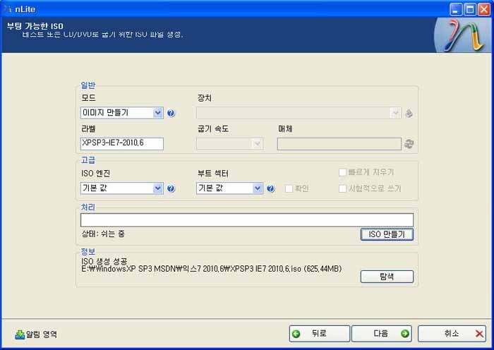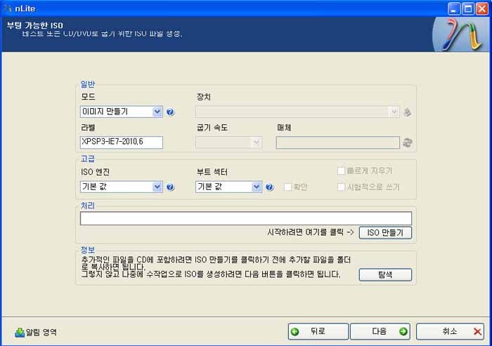 밑에 화면은 다음을 눌렀을 때 화면이구요. 그림에 보시면 라벨이 보이시죠? 여기다가 저는 IE7을 기준으로 만들었으니 XPSP3-IE7-2010.6 ⇐ 이렇게 적었구요. 띄어쓰기는 안 됩니다. 참고하시고, ISO만들기를 클릭하시면 저장할 창이 뜨니 왼쪽에 내 문서를 클릭해서 파일이름을 알아보기 쉽게 적고 저장 누르시면 이제 ISO 파일이 만들어지는 과정을 거칩니다.