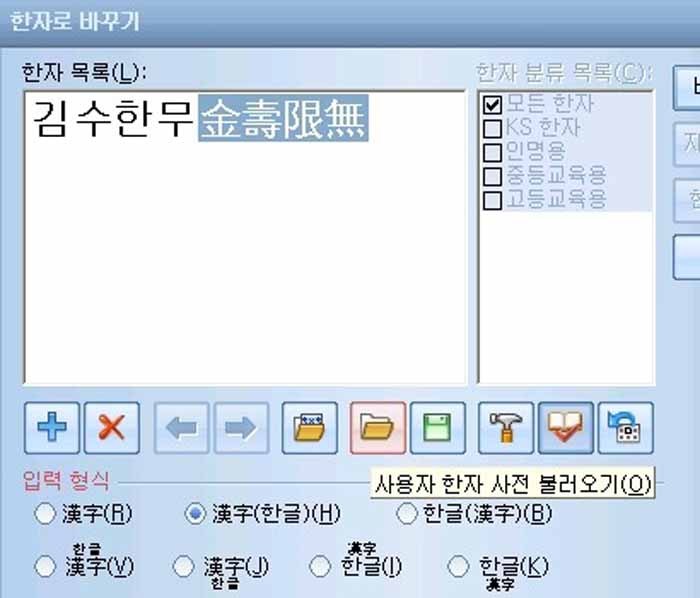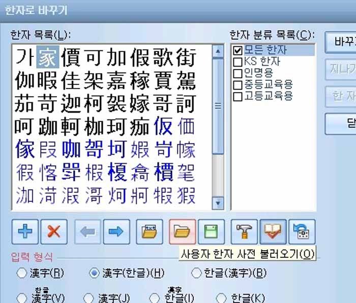 여기에서 디스켓 그림 왼쪽의 '불러오기(사용자 한자 사전 불러오기)' 모양(도구상자)을 누르면, 아래와 같은 화면이 뜹니다.
