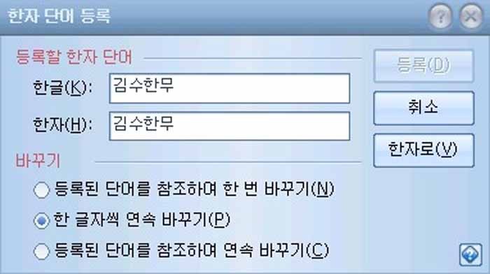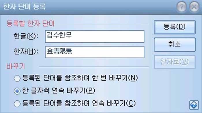 가령 ‘김수한무’를 새로이 한자 단어로 등록해 봅시다.