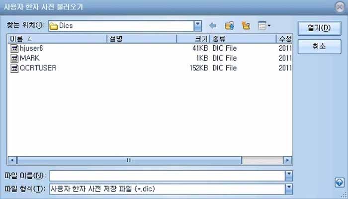 여기에서 '불러오기'(사용자 한자 사전 불러오기) 모양을 클릭합니다. 그러면 위에서 본 것처럼 아래와 같은 창이 뜰 것입니다.