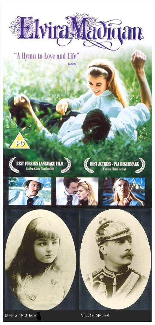 엘비라 마디간(Elvira Madigan, 1967, 스웨덴 영화) 감독 : 보 비더버그 출연 : 피아 데게르마르크 (엘비라 마디간 역), 토미 비르그렌 (식스틴 역) 각본 : 보 비더버그 촬영 : 요르겐 페르손 |