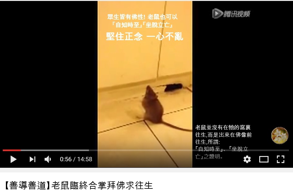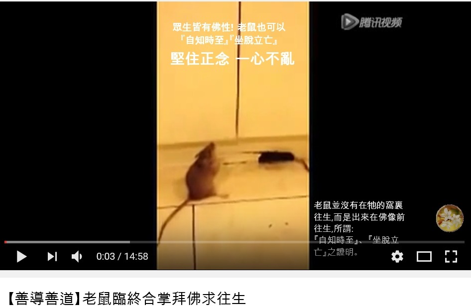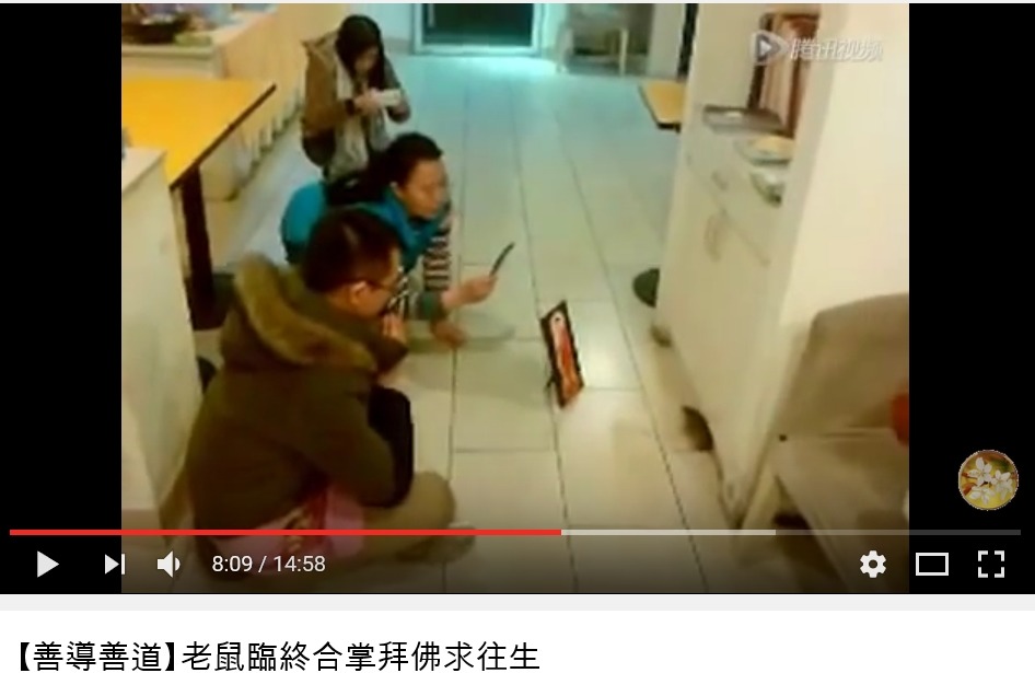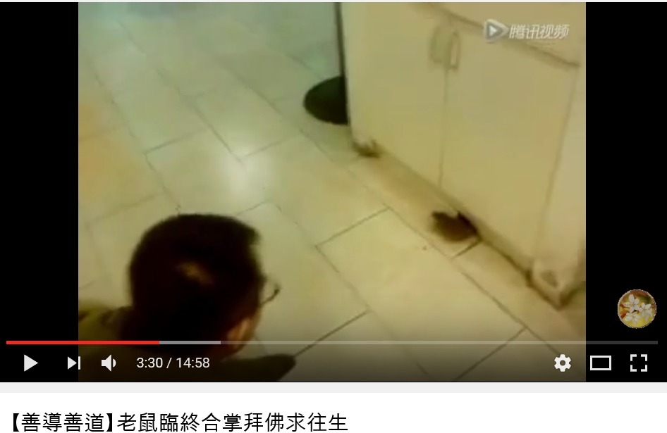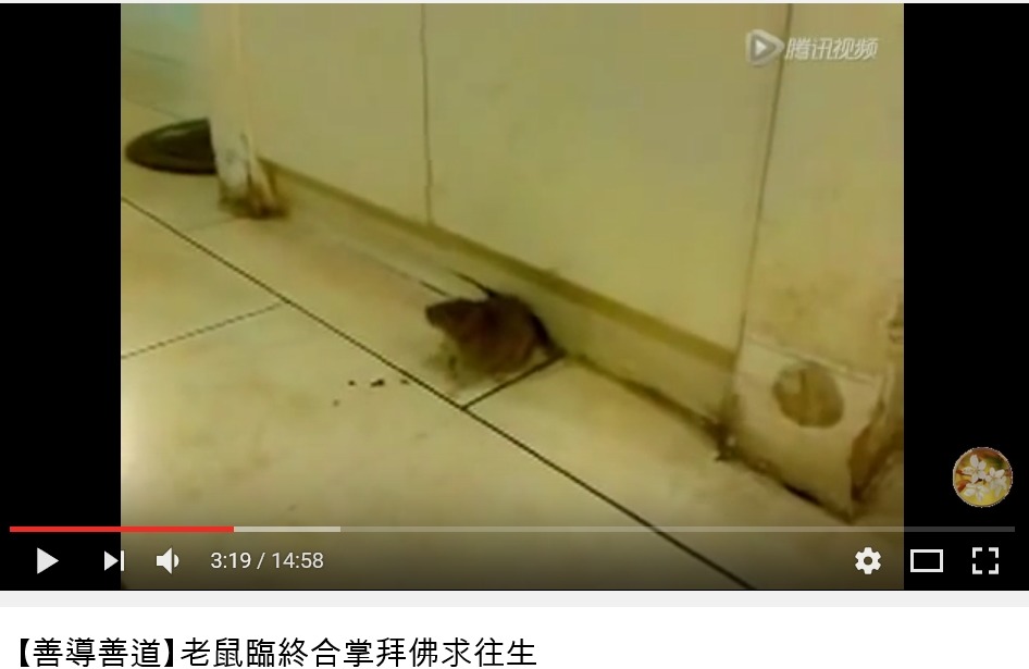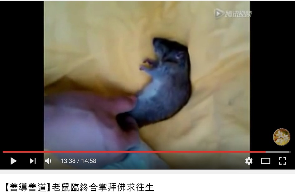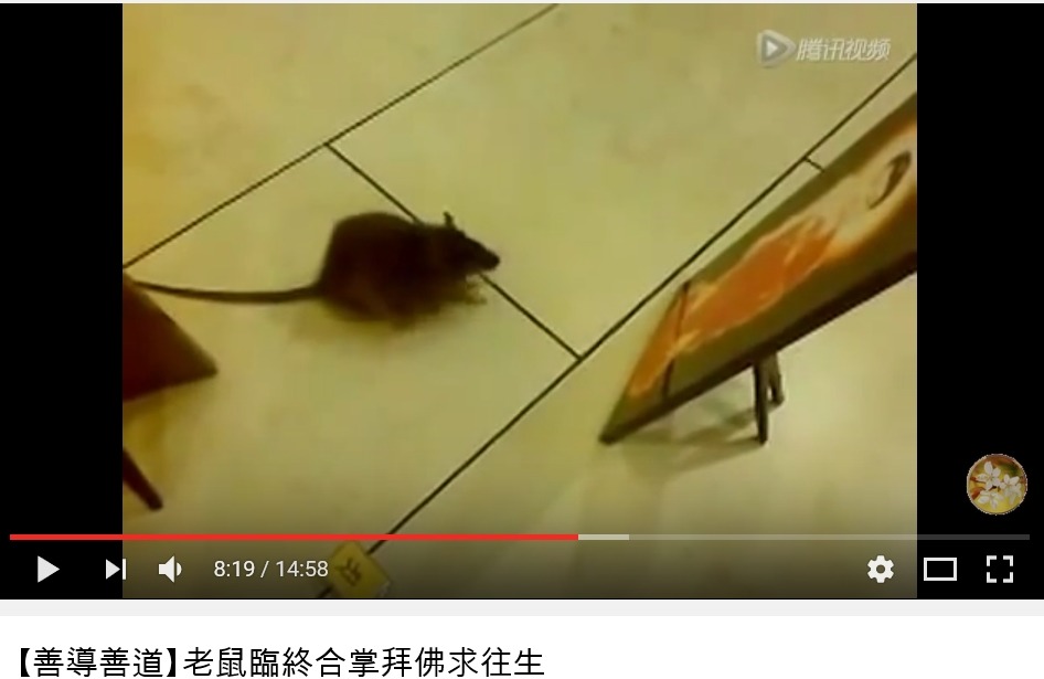 霍居士是成都清水荷花素食餐廳的老闆。餐廳裡有佛台長期供奉阿彌佗佛和地藏菩薩像,佛台有念佛機,24小時不中斷佛號。霍居士和服務員經常利用閒暇時間在餐廳裡念佛,唸經,討論佛法。佛台下有兩個老鼠洞,裡面有兩隻老鼠,霍居士和服務員從來沒有傷害它們,有空還經常放些剩飯,剩菜餵它們。老鼠們也非常聽話懂事,從來不去廚房偷吃東西,也不破壞任何東西。​ 2014年1月22號傍晚,餐廳還在正常營業,老鼠從洞裡出來,在佛台前的地面上很痛苦的打滾,霍居士及服務員看見後立刻為老鼠念佛,還在老鼠面前擺上阿彌佗佛像。老鼠顯得十分痛苦,不停打滾,聽到佛號聲,忍著劇痛哆嗦著不停拜佛。老鼠仰著頭,含著眼淚,合上前爪長時間地對著佛像拜。有時候身體抽搐,也不停止拜佛。拜佛拜得太累了,稍稍休息一會再接著拜。​ 由於霍居士及服務員都沒有助念的經驗,他們為老鼠助念了兩個小時就關門離開了。直到第二天開門發現老鼠只一息尚存,他們才意識到自己犯了嚴重的錯誤,才立即通知了成都昭覺寺普慧法師前來助念,等普慧法師趕到老鼠已經斷氣往生了。霍居士還請來當地有名的居士來為老鼠超度了三天,最後將老鼠安葬在昭覺寺內。​ 視頻是清水荷花素食餐廳的幾位師兄用手機錄製的,包括頭天助念和後來的居士超度及埋葬過程片段,時長合約近兩個小時,為便於上傳和觀看,編輯壓縮到15分鐘左右。​ 歡迎各位轉發轉載,此文及視頻如有任何一點功德,均回向給盡虛空遍法界一切眾生,祈願諸佛菩薩加持均離苦得樂,成就無上菩提!