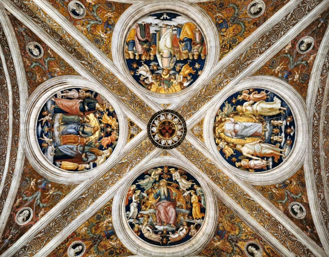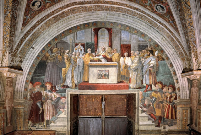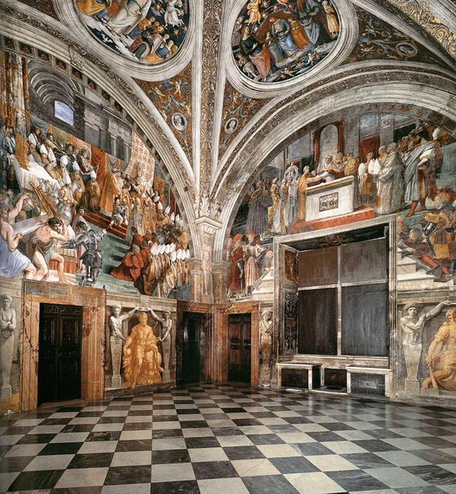 ΈλΌκ³ λΆλ¦¬λ νΌμνΈλ‘ λ°λμΉ(Pietro Vannucci aka Pietro Perugino)μκ² μ²μ₯μ μλ’°νλ€. κ·Έ μ°μν κ³νμ μ¨λ¦¬μ°μ€ 2μΈ λΉμ μ΄ λ°©μ΄ κ΅ν©μ΄ μ£Όμ¬ν μΈλν¬λΌ κ·ΈλΌν°μμ(Segnatura Gratiae et Iustitiae)μ νμλ₯Ό μ£Όμ΅ν λ κ°μ§κ³ μλ κΈ°λ₯μ λ§νλ€. μ¬μ€ ν루기λ