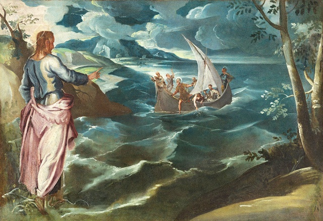 하늘에는 먹구름이 잔뜩 끼었고 큰 파도와 거친 바람이 배를 삼킬 듯하다. 그런데 예수님은 거친 파도 위에 서서 제자들에게 오른손을 들어 장엄하게 손짓한다. 불안에 떠는 제자들을 안심시켜 주신 것이다. 예수님이 뻗은 팔은 자석처럼 베드로를 끌어당긴다.