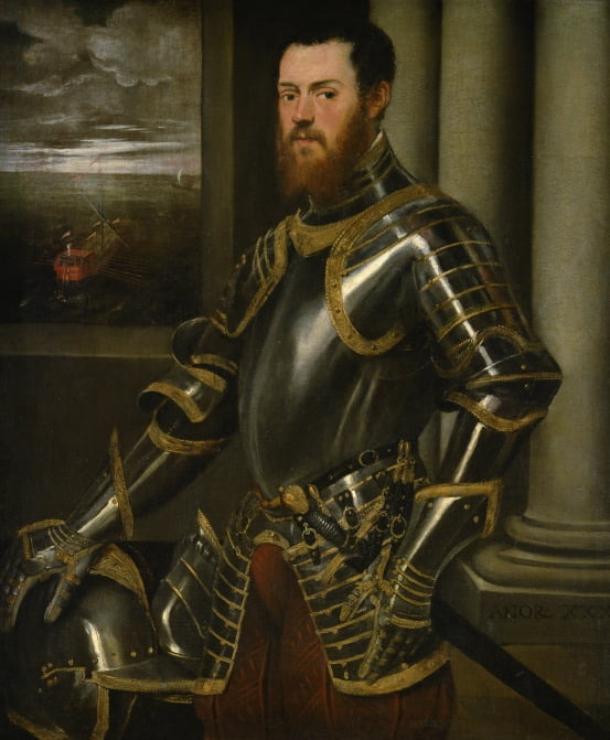 초상화와 종교화, 역사화와 전투 장면 묘사 등 다양한 종류의 그림에 능통했던 틴토레토는 ‘갑옷을 입은 남자’ 작품에서 자신의 기량을 마음껏 펼쳤다. 턱수염을 기른 남성의 얼굴을 사실적으로 묘사하면서도 갑옷의 우아한 금장식과 반사광까지 세심하게 포착했다. 창문 밖 바다에는 붉은색 군용선이 떠 있다. 선박 위에 그려진 하얀 조각상은 짐꾼, 여행자 등의 수호성인인 크리스토포로스를 묘사한 것이다. 그의 당당한 눈빛과 자세는 자신감, 갑옷과 군용선은 삶의 궤적을 드러낸다. 공화국 해군에 복무하며 해상 원정에서 부를 축적한 베네치아 귀족으로 추정된다