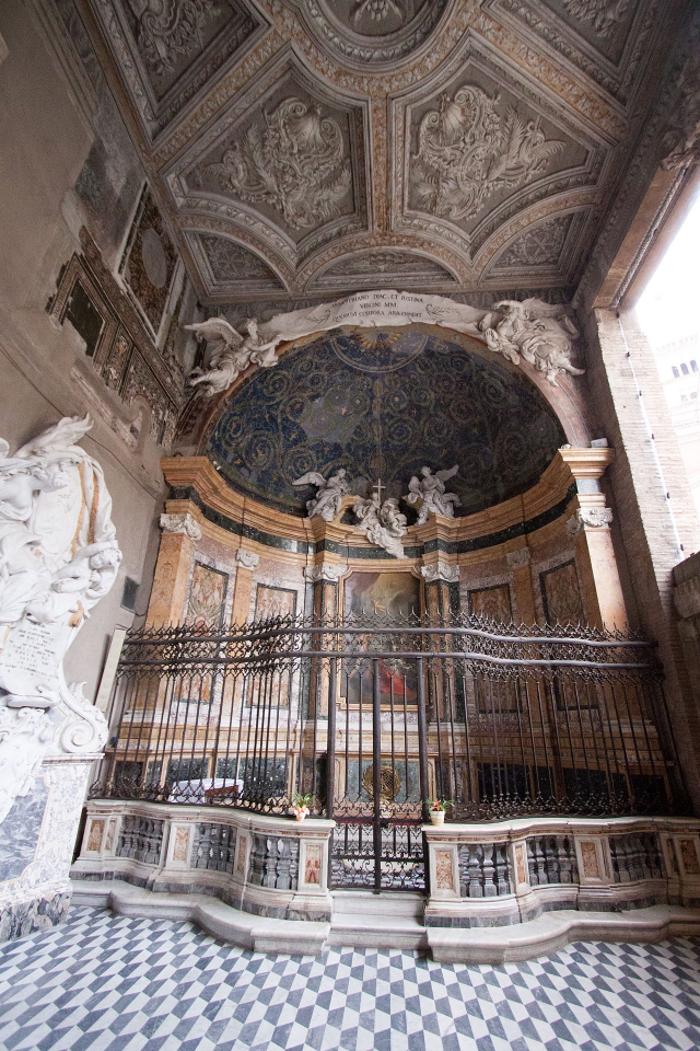 4개의 반원을 중앙의 정사각형에 접목하여 8개의 큰 밭을 형성하여 동식물이 분명한 성체의 상징으로 가득 차 있습니다. 그러나 라벤나 지역에서도 여러 참조가 있는 상징적 전통주의를 재개하는 것으로 보이는 이 시대의 주제는 레오 1세 교황이 수행한 이미지의 개념적 확장이라는 맥락에 포함되어야 합니다.(440-461) 이후.