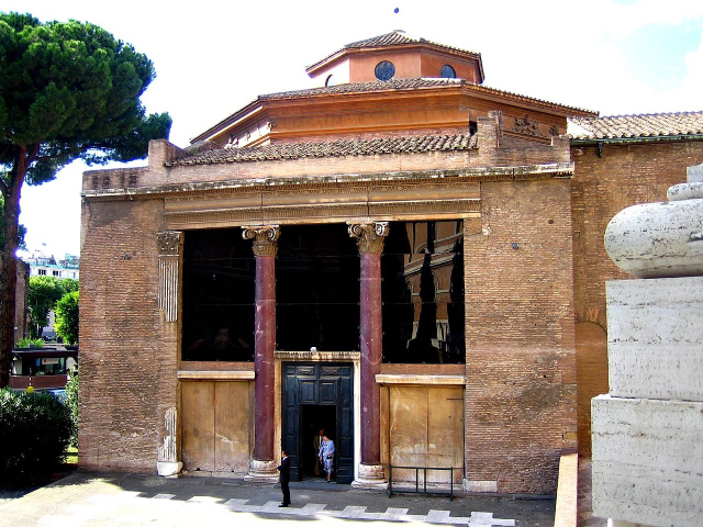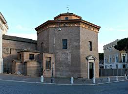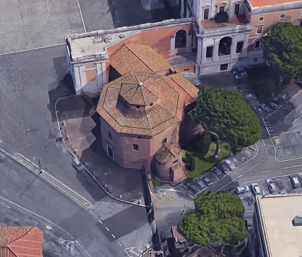 대략 5 세기의 재구성에 대응하는 건물은, A의 팔각형 계획 갖는 돔형 지붕 열 두 행의 지원을 : 최저 여덟 구성되어 붉은 반암 열에 의해 워크에 넣고, 6.3 미터 높이 세르지오 III 의 시간으로부터 회복 종탑 (904-911) 포프 스티븐 IV (816-817) 황폐하고, 및 복합 수도 실행되는 대리석 Entablature를 침례 축 절 각인되는 단계; 위쪽은 Innocenzo X 가 의뢰했습니다.흰색 대리석으로 된 8개의 더 얇은 기둥은 팔각형 랜턴, 타원형 창문이 있는 돔 및 돌출된 랜턴을 지지하는 구조로 되어 있습니다.