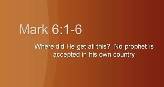 고향 나자렛으로 돌아오신 예수께서 안식일이 되어 회당에서 가르치시자 많은 사람들이 그 말씀을 듣고 처음에는 놀라운 반응을 보였다. 그러나 곧바로 꼬리에 꼬리를 문 의문을 제기하였다. 사람들은 예수가 가진 지혜의 정체에 대하여, 그 지혜의 출처에 대하여 묻고, 그들이 예수에 대하여 알고 있는 직업, 부모, 친척, 인척들에 대하여 논하면서 포괄적으로 부정적인 태도를 취하였다. 그