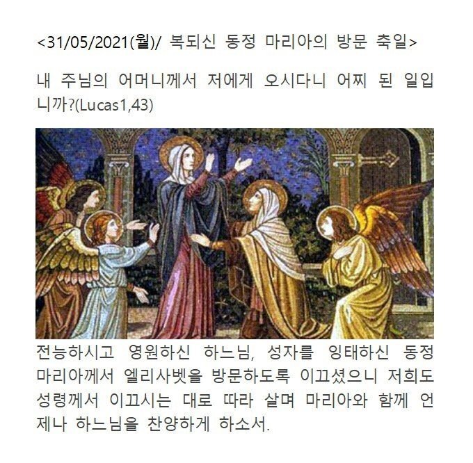 해마다 5월 31일에 지내는 ‘복되신 동정 마리아의 방문 축일’은 성모 마리아께서 예수님을 잉태하시고, 친척이며 세례자 요한의 어머니인 엘리사벳을 방문하신 것(루카 1,39-56 참조)을 기념하는 날이다.