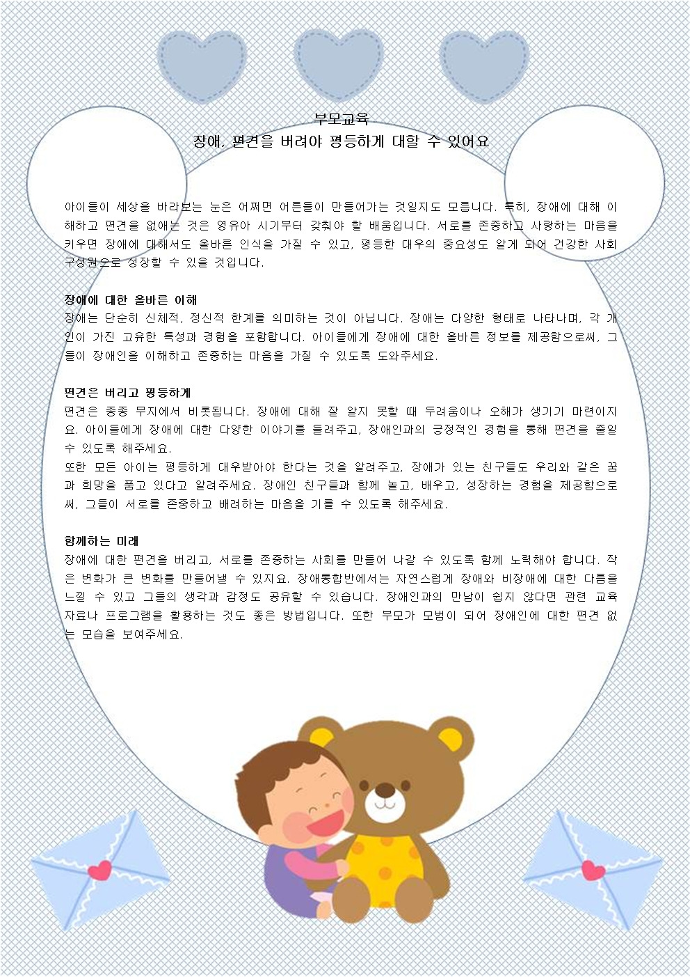 부모교육자료 장애, 편견을 버려야 평등하게 대할 수 있어요 작성자백합 선생님|작성시간26.04.03|조회수11 목록 댓글 0 글자크기 작게가 글자크기 크게가 다음검색 현재 게시글 추가 기능 열기 북마크 공유하기 신고 센터로 신고 댓글 댓글 0 댓글쓰기 답글쓰기 댓글 리스트
