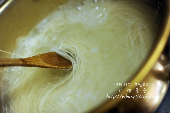 7, 카레를 만드는 동안 국수 도 얼른 삶아 찬물에 헹궈 사리지어 놓습니다.