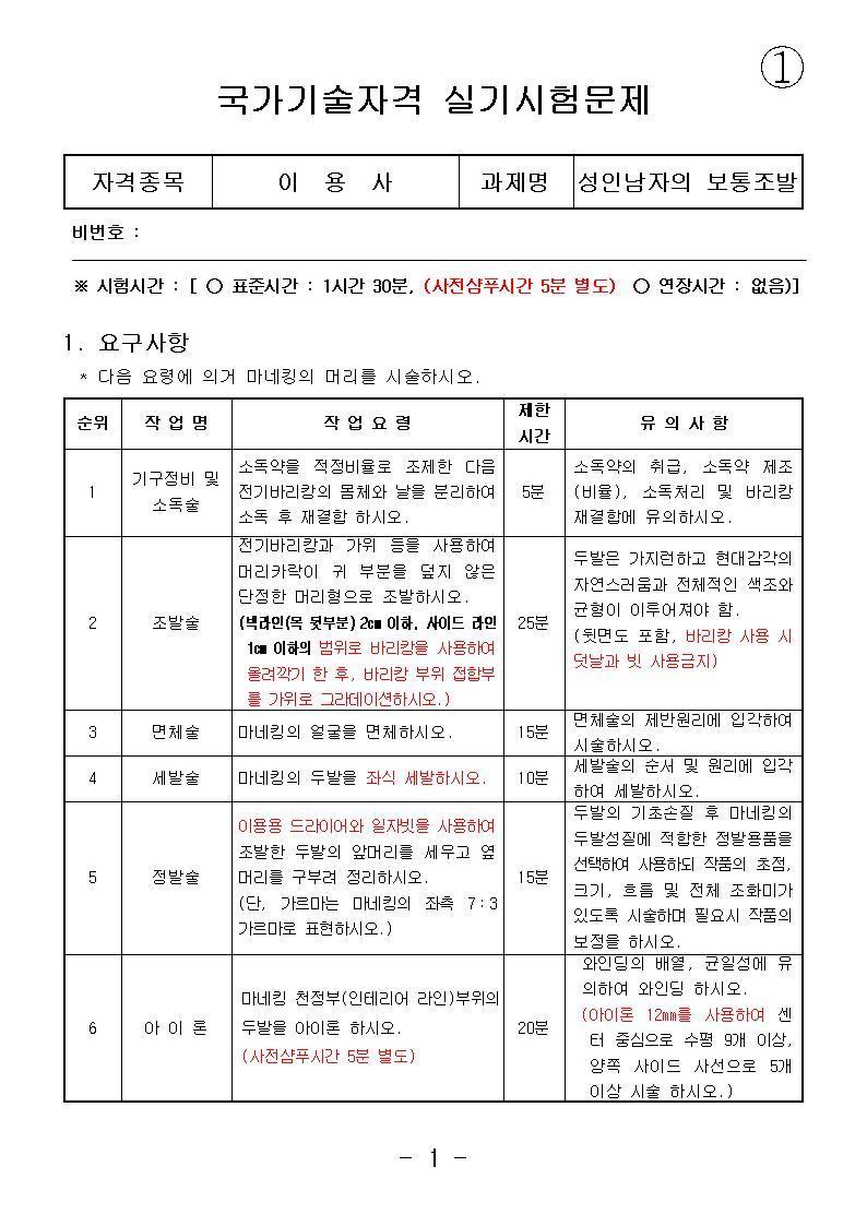 이용사 실기시험 문제지 (성인남자의 보통조발형).....Q-net 규정 작성자실기시험감독관 (남)|작성시간16.06.20|조회수191 목록 댓글 0 글자크기 작게가 글자크기 크게가 이용사 실기시험 문제지 (성인남자의 보통조발형).....Q-net 규정 다음검색 현재 게시글 추가 기능 열기 북마크 공유하기 신고 센터로 신고 댓글 댓글 0 댓글쓰기 답글쓰기 댓글 리스트