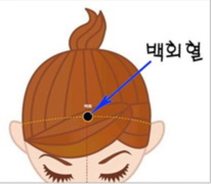 양쪽 귓구멍과 코에서 머리 위로 선을 그을경우 정수리 중앙에서 만나는 지점이 "백회혈"이에요