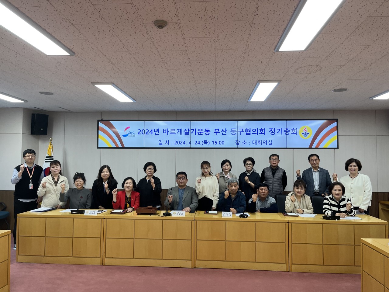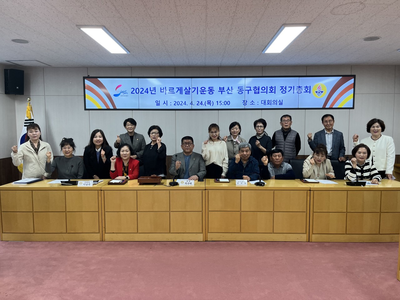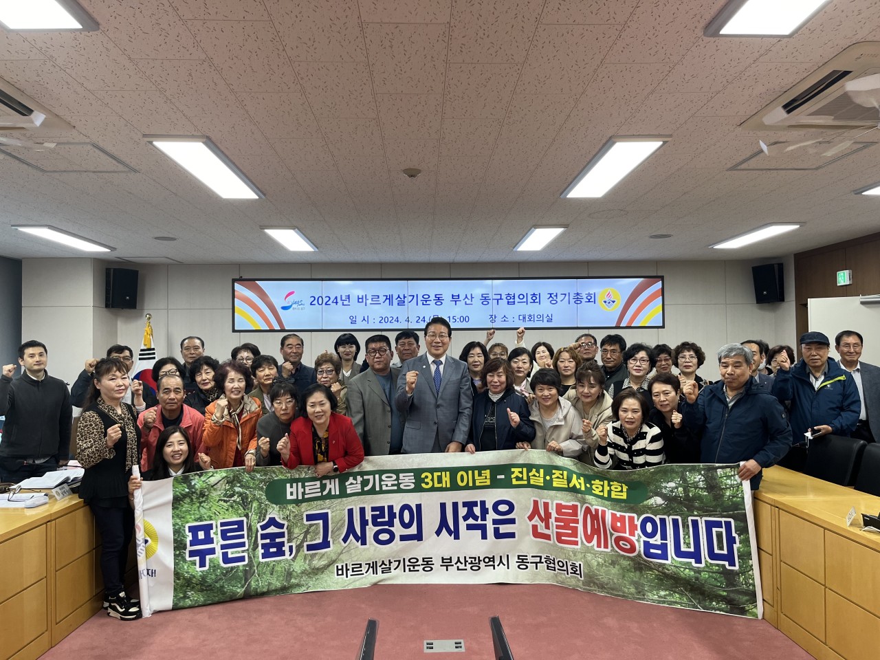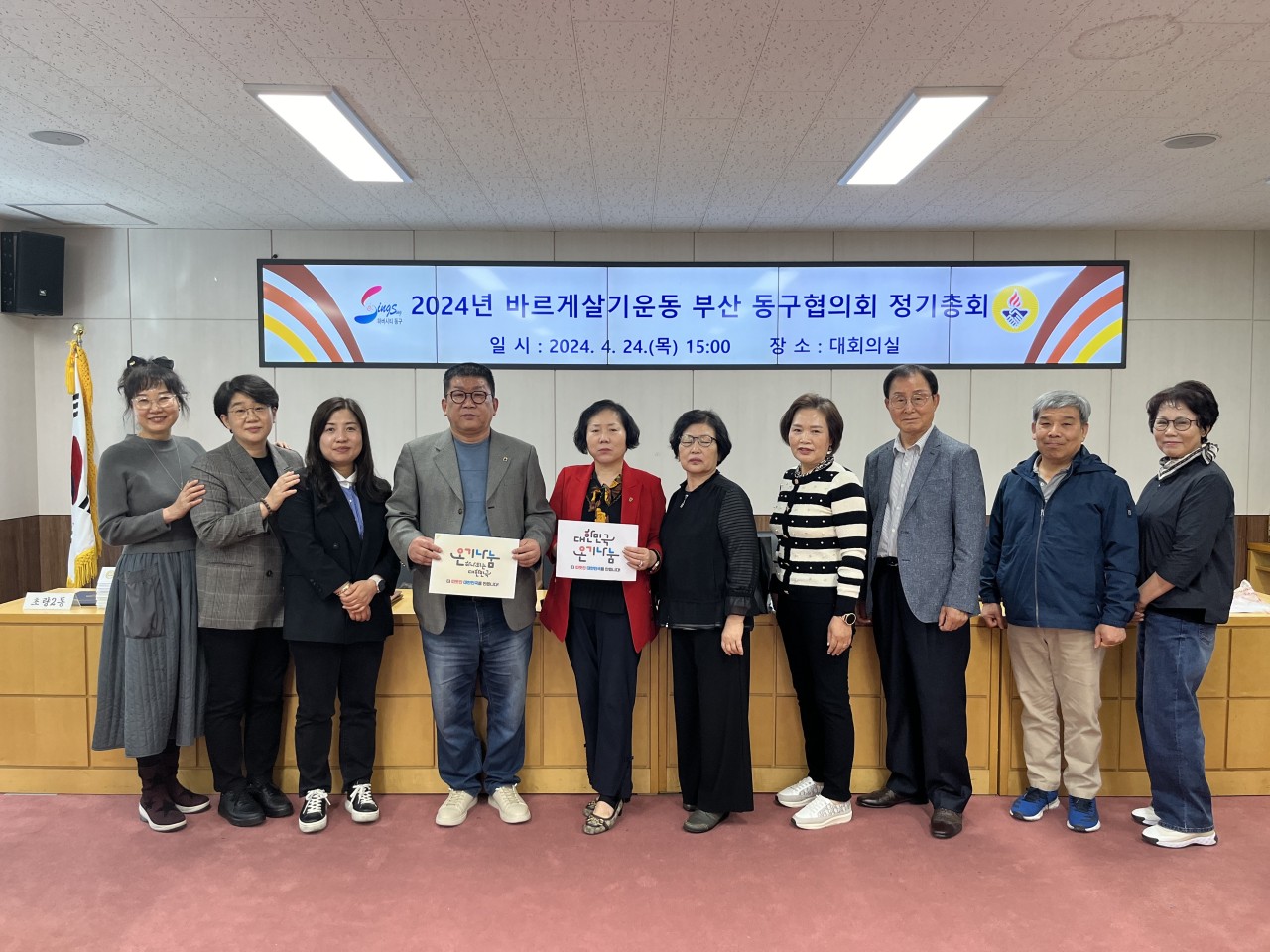 바르게살기운동 부산동구협의회(회장 박규태)는 2024.4.24(수) 오후3시 동구청대회의실 2층에서 구ᆞ동 임원님과 유공위원, 초청내빈이 참석한 가운데 2024년 정기총회를 다음과 같이 개최하였다.