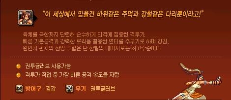 특화된 무기인 권투글러브를 사용함으로써 매우빠른공격속도와 강력한 데미지를 자랑합니다.