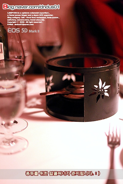 메인이 준비되어지는 타임엔 이렇게 퐁듀를 뜨겁게 달궈줄 알콜 버너가 준비된다.