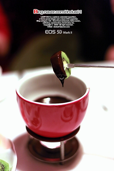 이렇게 초콜릿 퐁듀에 디저트과일을 퐁당 빠뜨려 맛있게 먹음된다.