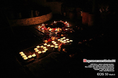 안으로 들어가면 자그만 정원이 나오고 그곳엔 촛불로 수놓아진 러브스토리라는 글귀가 만들어져 있다.