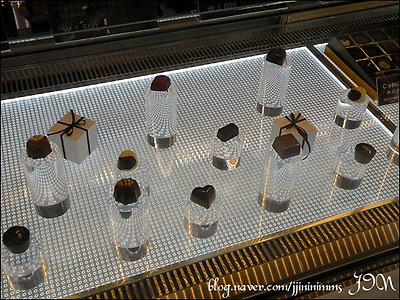 투명한 유리 기둥 위에 초콜렛이 올려져 있는데