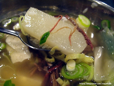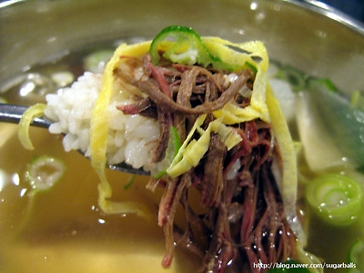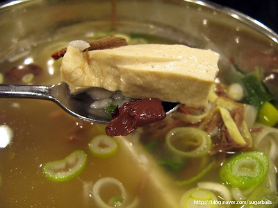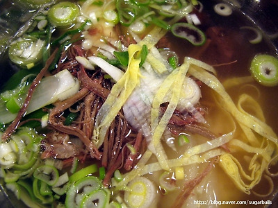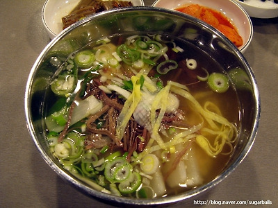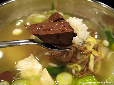 맑은 소고기 국물에 무, 선지, 두부 등을 넣어 담백한 맛.