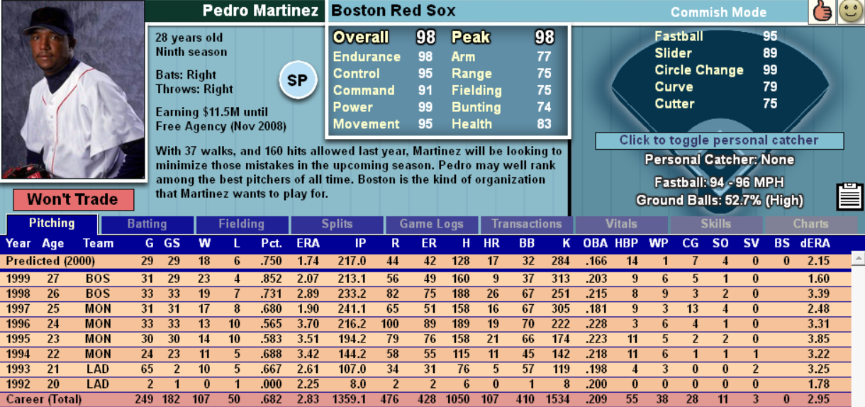 보스턴의 페드로 마르티네즈는 실제 2000년 성적 18승 방어율 1.74 284삼진 기반으로
