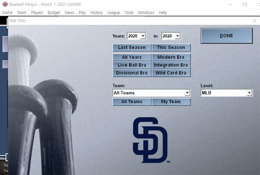 2. 새롭게 추가된 기능이 있는데, 리그 리더 창에 연도별, 팀별, 리그 별로 세부화된 기록을 필터를 걸어서 볼수있습니다.
