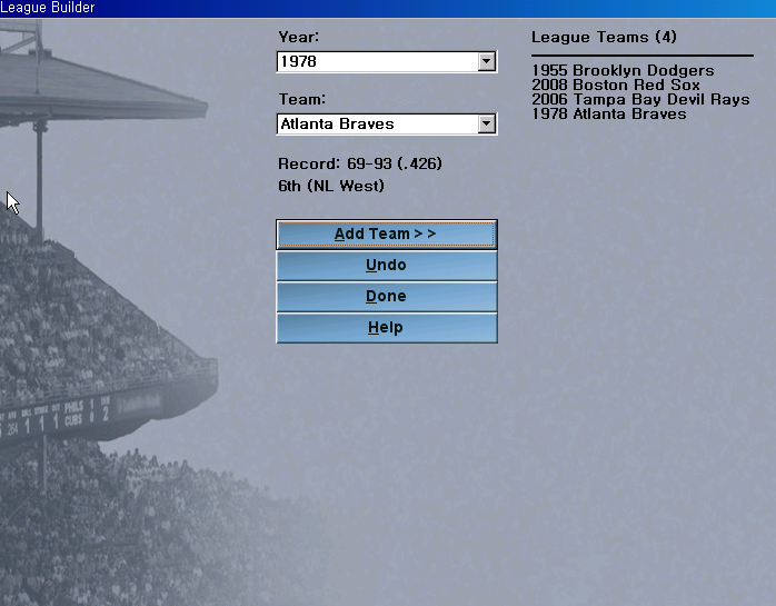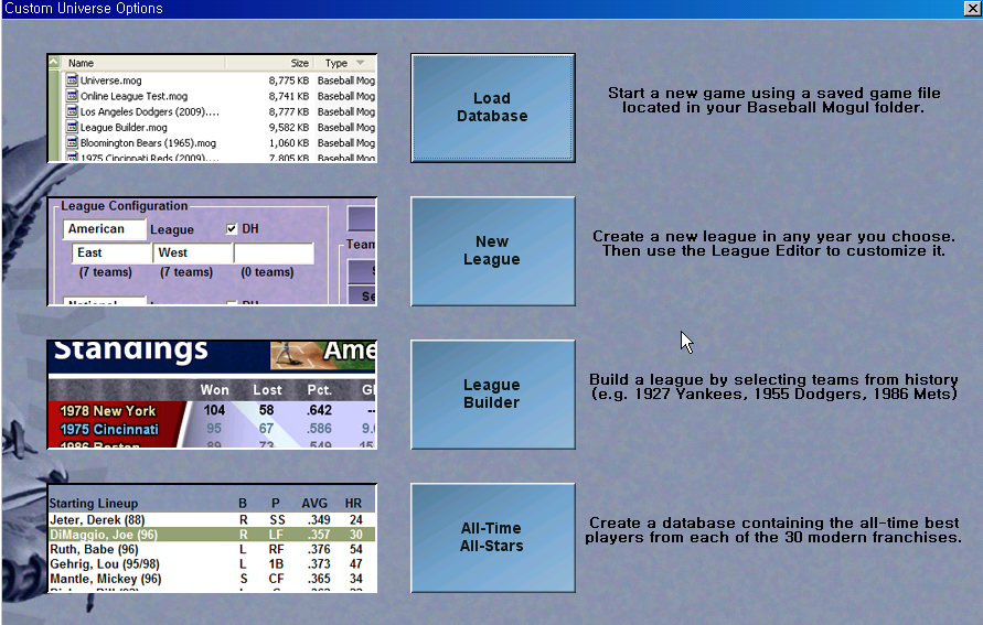 리그 빌더 League Builder 당신은 쉽게 야구 역사에 다양한 팀으로 된 리그를 만들수 있습니다. 리그 빌더는 리그의 해당 팀을 자동적으로 만듭니다. 만약 지구 구조를 다양하게 하고싶다면, 야구 유니버스를 만든후 리그 편집기 League Editor 에 가서 할수 있습니다.