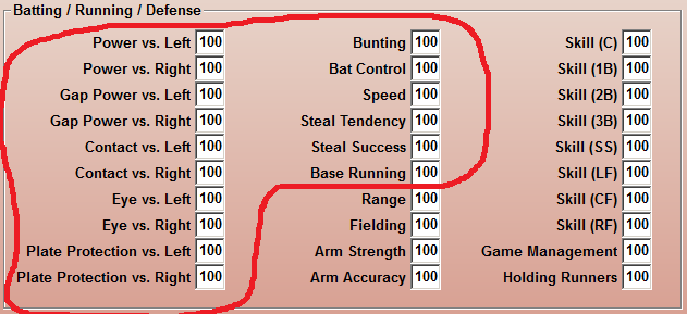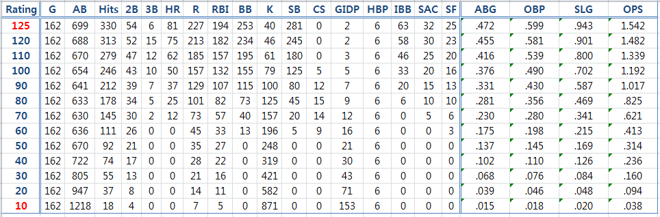 Power부터 시작해서 Base Running까지 각 등급별로 모두 동일한 10단위로 수치를 입력해서 나오는 예상 성적을 정리했습니다.