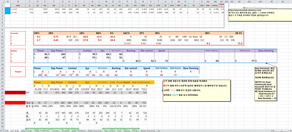 Baseball Reference의 선수페이지중 통산 좌/우 투수 성적을 그대로 복사해서 붙여넣고