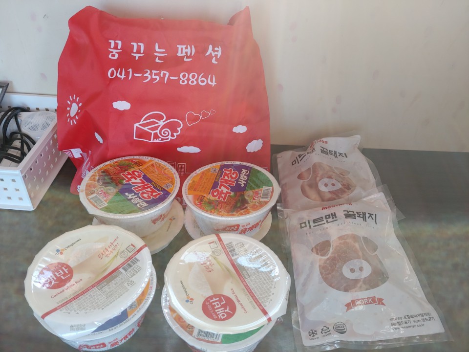 농심육개장사발면 4개/배추김치(수입) 1kg이 들어 있는