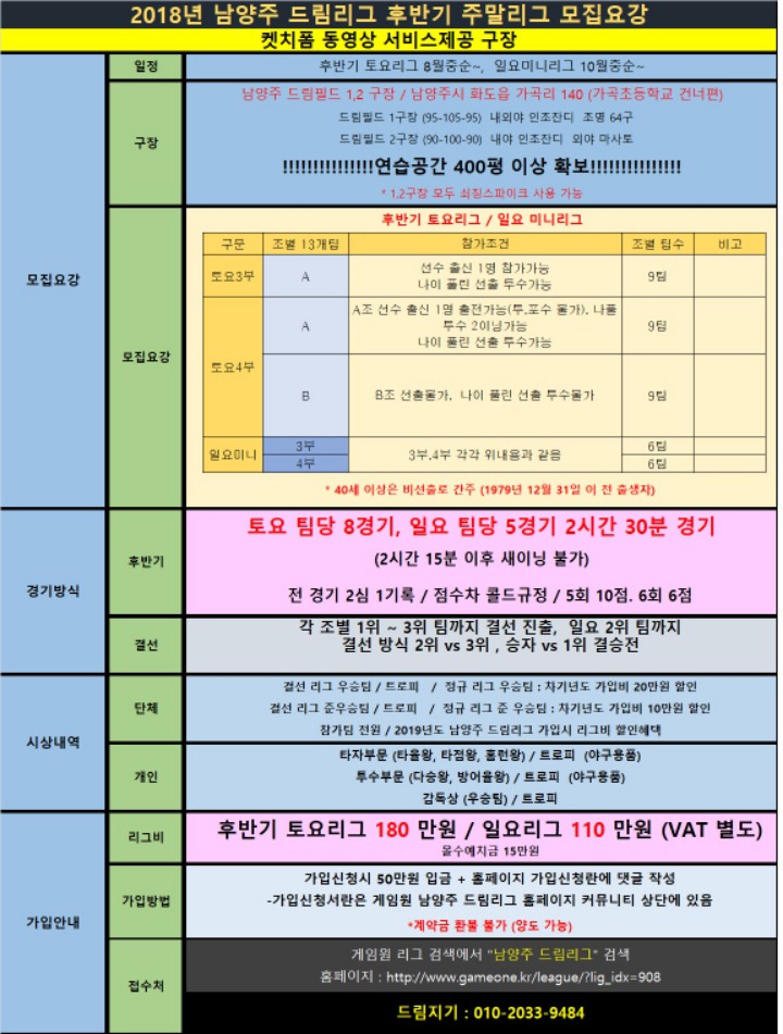 "넓은 연습 공간과 넉넉한 게임시간 2시간 반경기" 2018년도 남양주 드림리그에서 후반기 토요, 미니리그 일요팀 모집합니다. 문의 주세요.