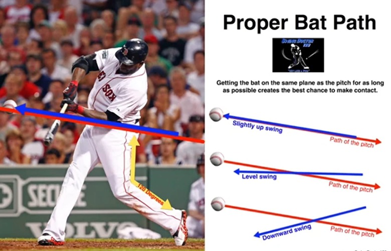 왼쪽 타자는 보스턴레드삭스의 전설적인 타자 데이비드 오티즈의 타격 모습시 방망이가 나오는 궤도를 파란색선으로 표시를 해두었고 공이 날라오는 궤적을 빨간색 선으로 표시해 두었습니다.