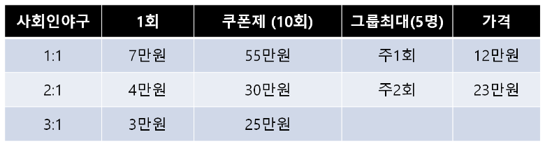 사회인 그룹레슨 정원은 투수 및 야수 모두 5명으로 진행 하고 있으며