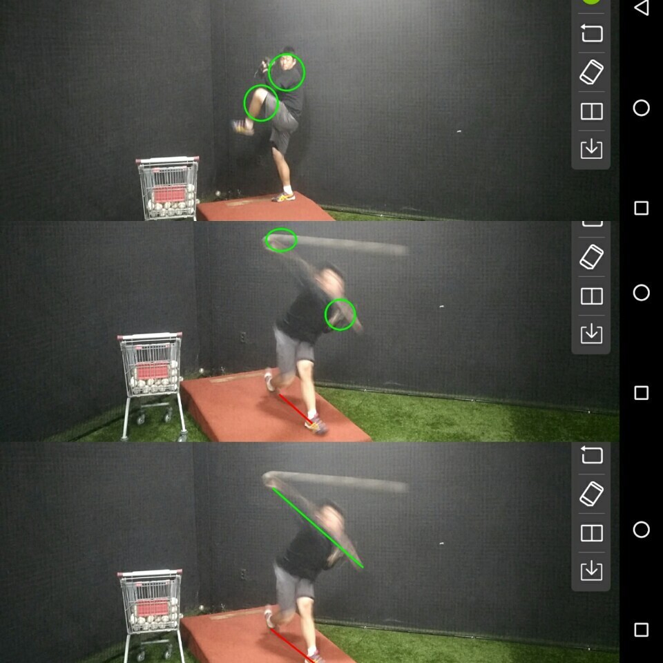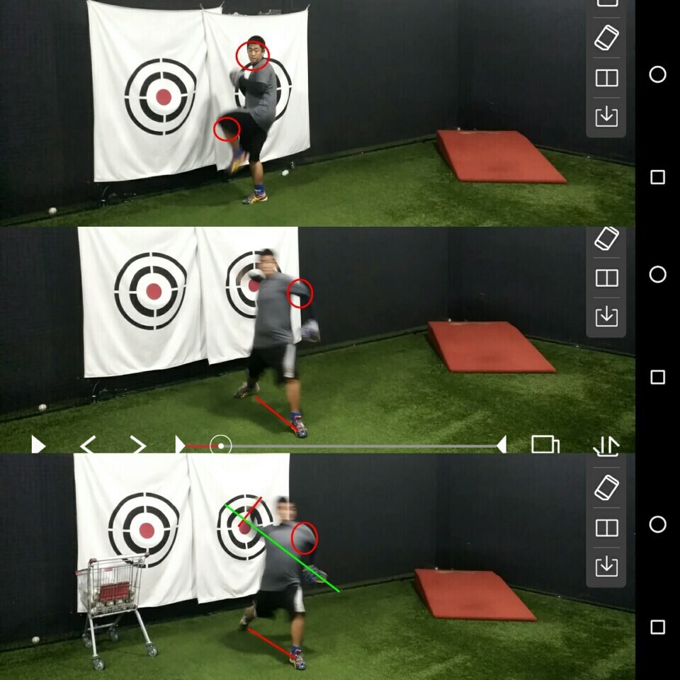 문제점: 투구 첫 스타트 시 키킹 부터 제데로 안 올라 갑니다. 시선 처리 또 한 정면으로 보지 않고 밑 을 봅니다. 그 다음 투구 동작을 나갈때 보폭 이 많이 못 나갑니다. 투구 회전시 왼쪽 어께가 안으로 잘 잡혀 있어야 되는데 확 벌어지는 빨간 표시 보이시지요? 저렇게 열려서 던지면 투구 힘 을 앞으로 전달 되지 않은 상태로 팔로 만 투구를 하게 됩니다. 또 한 팔 위치 가 초록선 라인으로 사선 각으로 나와야 공 을 때릴 수 있는데 왼쪽 어께가 열려 있으니 당연히 때리는 릴리스포인트 까지 못 끌고나와 공 을 밀어 던질 수 밖에 없습니다. |